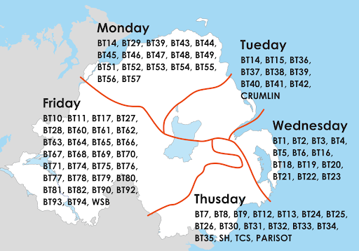 - The day of your delivery is influenced by your location. These are the areas we deliver to across NI by day: